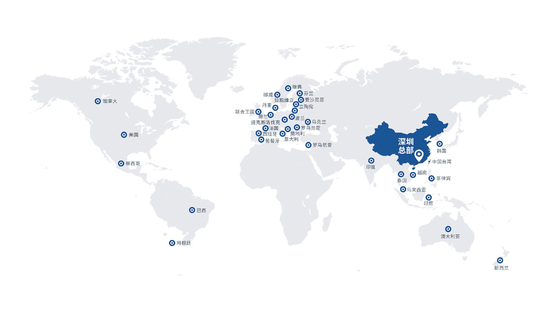 立足于國內(nèi)深圳、張家港、常州、天津、長沙、蘇州、濟南生產(chǎn)基地與備品備件庫,國內(nèi)外轄180+辦事處,在100多個國家和地區(qū)設立銷售服務機構(gòu),為全球用戶提供高品質(zhì)的產(chǎn)品與優(yōu)質(zhì)高效的服務。